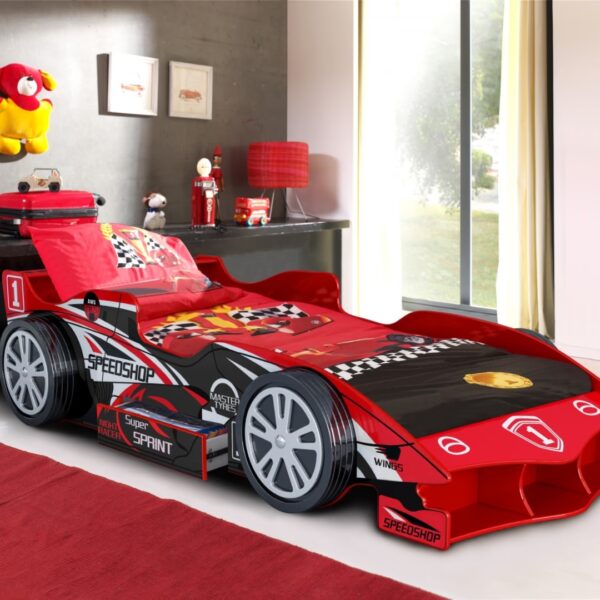 The bed is made with MDF, giving it a sturdy structure, and features standout wheels to give it the look of a real car. The red color and design makes it a great way for boys to show off their personality. Plus, there is front storage and a drawer on the side giving lots of storage for all your child's toys and books. Let your child's dreams come true with the Speed Car Bed!